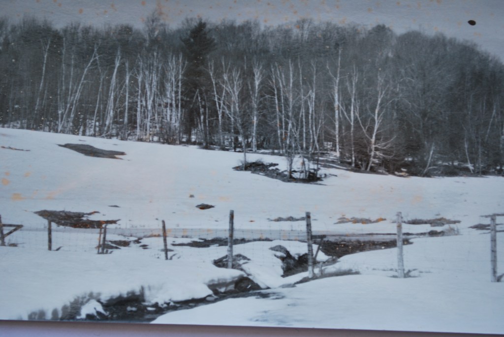 From a very old photo in black and white. Early spring in Québec, on the road down from the Abby. Sky, water, snow, birch, the remains of a fence.